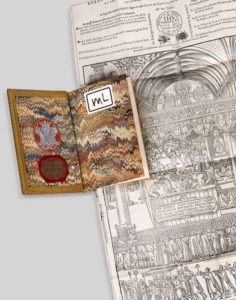 BOULAESE (Jean). L’abbrégée histoire du grand miracle par notre Sauveur et Seigneur Jesus Christ en la sainte Hostie du Sacrement de l’Autel, fait à Laon 1566. Escrite et augmentée avec sa carte représentant le tout au vif... par Jehan Boulaese, prêtre, professeur des saintes lettres hébraïques, et pauvre du collège de Montagu. A Paris, chez Thomas Belot, 1573. In-18 réglé, maroq. citron, motif doré aux angles, dent. intér., tr. dor. (Trautz-Bauzonnet). Ce livre relate l’histoire de Nicole Pierret, née Obri, de Thiérarche en Picardie, qui, possédée du démon, fut délivrée par la communion en présence de nombreux réformés. Le volume est orné d’une grande et belle planche se dépliant, gravée sur bois représentant la cathédrale de Laon au moment des cérémonies de l’exorcisme. Cette planche, animée de nombreux personnages, rappelle celles qui furent éditées par Jean Le Clerc. Très bel exemplaire finement relié par Trautz au milieu du XIXe siècle, de ce volume de la plus grande rareté. Caillet, 1524. A figuré au Bulletin Morgand (No 25983). Des bibliothèques de Stanislas de Guaita (ex-libris) et Ed. Rahir (ex-libris, 2e vente, 1931, No 430 du cat.).