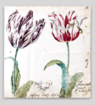Ces gouaches d’une qualité exceptionnelle, à la fois documentaires et artistiques, représentent pour la plupart des tulipes au naturel, d’autres des fleurs à oignons : jonquilles, narcisses, lys ou iris. Chaque peinture représente deux, trois ou quatre fleurs. L’une des gouaches est signée Anthony Claesz et datée de 1647. Anthony Claesz était un peintre de fleurs renommé, originaire d’Amsterdam ; six gouaches ne sont pas signées ; deux sont signées A. C. F. (Anthony Claesz) et sont datées de 1651 et 1654 ; vingt portent un monogramme C. H., l’une d’elles datée de 1653 ; quatre sont signées K, huit M E. B. et deux C. L. ; enfin quatorze portent le monogramme T. H. qui est peut-être celui d’Anthony Claesz sous son prénom hollandais de Theunis. (1 pl. avec déchirure marginale consolidée au verso, qqs. pl. tachées dans les angles.)