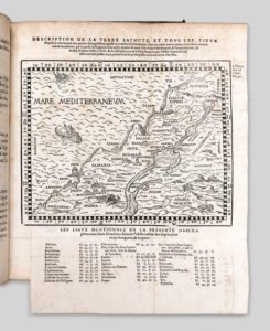 REGNAUT (Anthoine), bourgeois de Paris. Discours du Voyage d’Outre mer au Saint Sepulcre de Jerusalem, et autres lieux de la Terre Saincte. A Lyon, aux dépens de l’autheur, 1573. In-4, 4 ff. (dont le titre), 266 pp., 6 ff. de table et 1 ff. blanc, vélin ivoire à recouvrement, tr. jasp. (Rel. anc.). PREMIERE EDITION de ce très beau volume, orné de 4 cartes repliées et de 92 figures gravées sur bois de différents styles, dont une grande partie sont l’oeuvre du Petit Bernard (Baudrier, IX, p. 344; cat. Rothschild, 2636). TRES BEL EXEMPLAIRE, dans sa première reliure en vélin ivoire, d’une jolie patine, portant l’ex-libris et le timbre de la bibliothèque de Le Tellier de Courtanvaux. Il ne possède pas le suppt de 26 ff. d’ordonnances qui fut publié à Paris séparément et n’a été ajouté qu’à quelques exemplaires. Le cat. Rothschild et Baudrier ne signale que 3 cartes dépl., la quatrième n’est signalée que par Brun qui ajoute : « ces planches sont rarement toutes réunies ». De la bibliothèque de Mme Daulnoy (I, No 190).