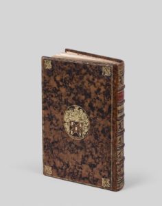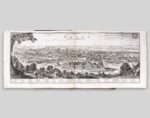 ZEILLER (Martin). Topographia Galliae, sive Descriptio et delineatio famosissimorum locorum in potentissimo Regno Galliae... Francfort, Gaspar Merian, 1655. Un vol.in-folio (sur 3), veau marbré, dos orné, armoiries sur les plats avec monogramme aux angles, répété au dos, tr. jasp. rouges (Reliure de l’époque). Première partie de l’édition latine, publiée la même année que l’édition allemande et flamande. La rédaction du texte avait été confiée à l’écrivain et géographe Martin Zeiller (1589-1661) mais l’ouvrage est précieux grâce à sa riche iconographie présentant des cartes, plans et vues des principales villes françaises ainsi que des bourgs, localités, châteaux, cloîtres, jardins, etc. Les gravures, ici en superbe tirage sont l’oeuvre de Gaspard Merian (1627-1687), fils de Matthieu Merian, en partie d’après les compositions de Peeter. Notre première partie comprend la région de l’Ile de France, elle est ornée d’un titre-frontispice avec portraits en pied de Clovis et de Louis XIV, titre, (4 f. de dédicace), 1 grande carte de France repliée, topographia pp. 5 - 80, 2 cartes de Paris et de l’Ile de France, repliées, 2 GRANDES ET CELEBRES VUES DE PARIS EN PERSPECTIVE, l’une datée de 1620, l’autre de 1654, toutes deux repliées, (4 ff. d’explication pour Paris), enfin 107 pl., dont plus de 80 sur double page ou repliées, dont un bon nombre portent deux vues, toutes montées sur onglets à l’époque et de toute fraîcheur, tirées sur un superbe papier filigrané: Vues, Palais, châteaux, Belles Demeures, Eglises, Jardins de Paris et des environs: Anet, Beauvais, Compiègne, St Cloud, St Denis, Corbeil, Etampes, Poissy, Ecouan, Fontainebleau, St Germain-en Laye, Lagny, Maisons-Lafitte, Meudon, Senlis... (4 ff. index et tables). Un des atlas topographiques les plus importants du XVIIe siècle. EXEMPLAIRE AUX ARMES ET CHIFFRES DE HELIE DU FRESNOY, provenance très rare. Le frontispice porte la signature du Duc de Valentinois et la date 1739, à l’encre, en marge, sous le sujet. Réf.: Brunet V, 1529.