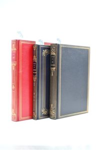 BAC (Ferdinand). Les Maîtresses. 100 Dessins en couleurs. Préface de Félicien Champsaur - Les Amants. 100 Dessins en couleurs. Préface par un amant - La Comédie féminine. 100 Dessins inédits. Préface de F. Bac. P., Simonis Empis, 1897-1899. 3 vol. in-8 carré, Bradel maroquin à grain long bleu ou rouge, dos ornés en long, encadr. de fil. dorés sur les plats, tête dor., n. r., couv. ill. et dos cons. (Bretault). UN DES 20 EXEMPLAIRES SUR JAPON (sur chine pour le dernier vol.), numérotés. Amusantes scènes galantes de la « Vie pa risienne » à la Belle époque. Superbes exemplaires reliés à l’époque (le 3e vol. annonce à la justification un dessin qui, beaucoup plus grand, n’a pas été relié dans le vol.). De la bibliothèque Maurice Méric (ex-libris).