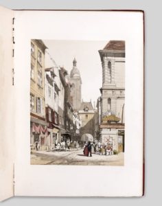 BOYS (Thomas Shotter) 1803-1874. Picturesque architecture in Paris, Ghent, Antwerp, Rouen, etc., drawn from nature and on stone. London, Boys, 1839. In-fol. (544x374), maroq. à grain long et soie rose, fers spéciaux avec écusson central, éb. (Rel. de l’édit.). Titre-frontispice et feuillet de dédicace lithographique, 1 ff. impr. de table et 25 magnifiques lithographies imprimées en couleurs par Charles Hullmandel. Cet ouvrage marque un sommet atteint dans la perfection de la chromolithographie. TRES BEL EXEMPLAIRE dans sa reliure d’origine de toute rareté. Provenance : Vente Lemallier, 1927. Abbey Travel 33 ; RIBA 353 ; Tooley 105.