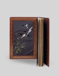 CHASSE. - FUSILLOT (Paul Réveilhac). Un début au Marais. P., Ferroud, 1892. Pet. in-8, maroq. rouge jans., encadr. intér. orné de dent. dorée, double de soie gorge de pigeon brochée d’oiseaux et de fleurs, gardes de même soie, tr. dor. sur témoins, couv. ill. et dos cons. (Dupré). Charmant ouvrage, illustré de 4 compositions de Ad. Lalauze, gravées à l’eauforte et 10 dessins de H. Giacomelli, gravés sur bois par Huyot. Superbe exemplaire sur PAPIER DE CHINE, hors commerce, contenant les eauxfortes en deux états (chine et japon), enrichi d’une jolie aquarelle originale de H. Giacomelli, « le peintre des oiseaux ».