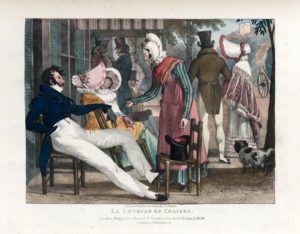 COSTUMES de Paris. Chalon (Jean-Jacques, dit John ou l’aîné). Twenty four subjects exhibiting the costume of Paris, the incidents taken from nature, Designed and drawn on stone by J. J. Chalon. London, published by Rodwell and Martin, C. Hullmandel’s lithography, 1820-22. In-fol., demi-maroquin marron à grains long, coins, dos orné or et à froid, tête dor., n. r., 3 couv. de livraison ill. lithogr. cons.. (Rel. dans le goût romantique). SUITE COMPLETE ET RARISSIME d’1 titre lithographié et 24 planches également lithographiées et coloriées à l’époque : La Dame du Café , La Marchande de Tisanne , L’Escamoteur , La Petite Fruitiere , Les Tondeuses de Chiens , Les Bonnes , Le Café , La Charette du Blanchisseur , La Marchande de Modes , La Porte Cochère , Le Journal des Débats , Le Restaurant , ’ La Loueuse de Chaises , Le Marché aux Fleurs , Le Marchand de Brioches , Le Porteur d’Eau , Une Matinée aux Thuilleries , Le Petit Décrotteur , La Prise de Tabac , Les Brodeuses , Les Adieux , Les Dames de la Halle , Le Cimetière du Père la Chaise , Les Dames Artistes . Abbey, Travel, 108. Colas 588. Hiler, p. 156. Lipperheide 1185. Ray, The Art of the French Illustrated Book, 124.
