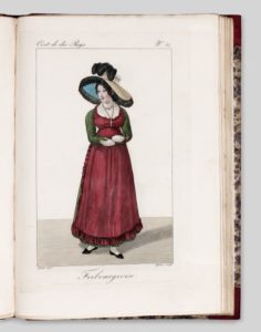 COSTUMES. - LANTE (Louis-Marie) & GATINE (Georges). Costumes des femmes de Hambourg, du Tyrol, de la Hollande, de la Suisse, de la Franconie, de l’Espagne, du royaume de Naples, etc... P., chez l’éditeur, [Imprimerie de Crapelet], 1827. In-4 (343x243), demi-veau cerise à coins, dos lisse orné (Reliure de l’époque). Edition originale. Exemplaire complet de cette belle édition illustrée de 100 grandes planches gravées par Gatine - d’après les dessins de Lanté et de Vernet, toutes rehaussées de couleurs vives, figurant essentiellement des costumes traditionnels de Hambourg (7), du Tyrol (6), de la Hollande (6), de la Suisse et de la France (48), de la Franconie (8), de l’Espagne (21), et de l’Italie (4). Ces costumes devenaient de plus en plus rares à l’époque ainsi qu’en témoignent ces mots : « Dans presque toute l’Europe les femmes de la première classe, et même celles de la seconde, prennent à tâche de suivre les modes de Paris : il a donc fallu, pour former une Galerie de Costumes caractéristiques, faire dessiner des costumes d’ouvrières, et même de servantes » (Observations préliminaires). Les costumes montrent des femmes et jeunes filles de la campagne ou exerçant divers petits métiers (bouquetières, cuisinières, filles de chambre, fruitières, laitières, servantes, etc.). Les explications sont rédigées par Pierre de La Mésangère (1761-1831), abbé mondain et éditeur du Journal des Dames et des Modes pendant 30 ans. Louis-Marie Lanté et Horace Vernet qui eurent la charge de notre ouvrage étaient des collaborateurs réguliers au Journal des Dames.