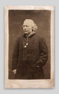 CARJAT (Et.). Portrait de Daumier. Vers 1861. Photographie originale d’époque sur papier albuminé au format carte de visite (870 x 540 mm.), contrecollée sur carton fort. Daumier y pose, les lunettes autour du cou, la main g auche dans sa poche. Joint : Une photographie originale de Pierre Petit en format id., portrait de Daumier en médaillon ovale. Ens. 2 p.