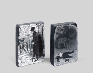 DAUMIER (H.). Mort de Justin, valet de chambre de Maulincour: « Ses amis, pris de vin comme lui, l’auront laissé se coucher dans la rue... ». (Bouvy, 734). 135 x 95 m m. Matrice originale du bois ayant servi à l’impression d’une des figures exécutées pour les « OEuvres complètes de Balzac » (Ed. Furne- Houssiaux, 1842-1855, vol. IX, front. de l’éd. Furne, page 69 de l’éd. Houssiaux). Sans nom de graveur sur bois. Joint : Ferragus, les deux mains sur sa canne : « Il s’appuyait contre un arbre quand le cochonnet s’arrêtait... ». (Bouvy, 735). 135 x 95 mm. Prov. identique, vol. IX, page 109. Graveurs sur bois: ABL (Andrew, Best et Leloir). ENS. 2 PIECES