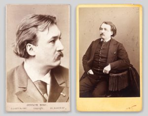 NADAR. Portrait de Gustave Doré. Photographie originale sur papier albuminé, au format carte de visite (105 x 63 mm.) contrecollée sur carton jaune de Nadar à l’initiale en bas à droite. Paris à l’adresse rue d’Anjou St Honoré, s.d. (vers 1867). Gustave Doré y pose le bras reposé sur une chaise à frange, la même que celle des portraits de Théophile Gautier, Edouard Manet ou encore Alexandre Dumas. Joint : Portrait de Doré par Elliot and Fry, Londres. Même format. Ens. 2 photographies.