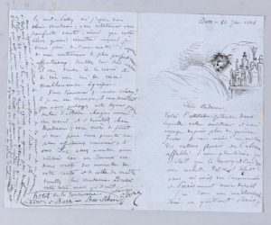 DORE (G.). Lettre autographe signée, illustrée de deux dessins, adressée à Mme Rossini, l’épouse du musicien. Barr, 30 juin 1868 (4 p. in-4 sur papier bleuté). Longue lettre pleine d’humour, accompagnée de croquis à la plume. En vacances en Alsace il est terrassé par une pleurésie. « Je suis la providence des pharmaciens qui font diligence pour broyer tous les produits que j’absorbe. La ville retentit jour et nuit du bruit de leurs pilons... J’espère bien vous retrouver en parfaite santé ainsi que votre cher grand maître auquel je vous prie de transmettre l’expression de mes sentiments les plus profondément affectueux. Veuillez lui dire combien il me tarde de le revoir et de rire avec lui de ma malheureuse équipée ».