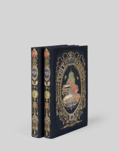 GAVARNI. Perles et Parures. Les Parures. Les Joyaux. Fantaisie. Texte deMéry. Minéralogie des Dames. Histoire de la Mode par le Cte Foelix. Paris, De Gonet, Martinon et Madame Veuve Janet ; Leipzig, Twietmeyer, s.d. [1850]. 2 volumes grand in-8, cartonnage percaline bleue, plats et dos ornés de plaques dorées et mosaïquées, tranches dorées (Reliure de l’éditeur). EDITION ORIGINALE ET PREMIER TIRAGE : 2 frontispices et 31 (16 + 15) planches gravées sur acier par Geoffroy d’après Gavarni, tirées sur chine appliqué. EXEMPLAIRE AVEC LES PLANCHES IMPRIMEES SUR PAPIER VELIN, FINEMENT COLORIEES, DANS DE BEAUX ENCADREMENTS SUR PAPIER ROSE DECOUPES EN DENTELLES. La réunion des deux volumes avec les gravures à marges de dentelles est assez rare à rencontrer ; elle est exceptionnelle lorsque ceux-ci sont en plus conservés dans le beau cartonnage polychrome de l’éditeur, comme c’est le cas ici.