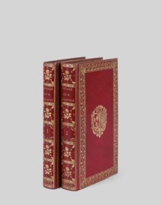 GOLOVNIN (Vasili). Voyage de M. Golovnin, capitaine de vaisseau de la marine impériale de Russie, contenant le récit de sa captivité chez les Japonais pendant les années 1811, 1812 et 1813, et ses observations sur l’empire du japon, suivi de la relation du voyage de M. Ricord, capitaine de vaisseau de la marine impériale de Russie, aux côtes du Japon en 1812 et 1813, etc. Trad. par J.-B.-B. Eyriès. P., Gide, 1818. 2 vol. in-8 de un portrait, (2) ff., VI, 396 pp. ; (2) ff., 452 pp. et une carte, maroq. rouge à grain long, dos ornés avec fleurs et feuillages, plats encadrés d’une large dentelle, armoiries, dent. intér., gardes de moire verte, tr. dor. (Rel. Pr Bradel). Rare édition originale de la traduction française par Eyriès. Elle est ornée d’un portrait en frontispice et d’une grande carte repliée hors texte de l’archipel des Kouriles. Un explorateur russe prisonnier des Japonais. Chargé par le tsar Alexandre Ier de dresser la carte des côtes et des îles orientales de la Russie proches du Japon, Vasili Golovnin (1776-1831) arriva au Kamtchatka en 1809. Au cours de l’année suivante, explorant les îles Kouriles revendiquées par les deux nations, il fut fait prisonnier par les Japonais. Il ne fut libéré qu’en 1813. Golovnin mit à profit sa captivité pour étudier les moeurs, sciences, industrie et commerce du Japon grâce, notamment, à ses échanges avec les lettrés japonais qui étaient, de leur côté, désireux d’enrichir leurs connaissances du monde occidental. On trouve, à la fin, le récit du capitaine Ricord, compagnon de Golovnin, qui négocia la libération des prisonniers. SUPERBE EXEMPLAIRE, dans une reliure signée de Bradel, aux armes de la duchesse de Berry, de toute fraîcheur. Ex-libris de la bibl. de Rosny, No 1411 du cat. de la vente. (Lada-Mocarski, n° 82, à propos du Voyage autour du monde de Golovnin paru à St Pétersbourg en 1822 : « Vasili Mikhailovitch Golovnin, one of the outstanding Russian naval officers of the nineteenth century, made several voyages to the North Pacific and the Northeast coast of America. He has left valuable accounts of his voyages » Chadenat, I, 581 : « Importante relation ».- Cordier, Japonica, 464-465).