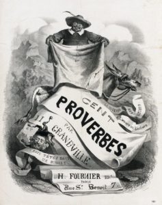GRANDVILLE (J.-J.). Affiche de Librairie pour les Cent proverbes par Grandville et par [trois têtes dans un bonnet]. Paris, Fournier Ed., Rue St Benoît 7, (1845). Grand in-folio en hauteur. Très belle et rare affiche d’intérieur lithographiée (Lith. de Lemercier), ornée d’une grande composition recouvrant entièrement la feuille, par Granville, non signée, mais citée par M. Maindron (p. 86). Elle reprend le sujet gravé de la couverture du volume, non reproduit dans le texte, représentant un paysan recouvrant son âne d’une toile rapiécée, avec, au premier plan, sept banderoles de différentes tailles.