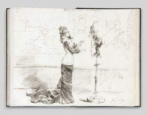 HALEVY (L.). Mariette. Quarante compositions de Henry Somm. P., Conquet,1893. In-8, Bradel maroq. bleu ciel à long grain, fleuron doré au dos, doubl. et gardes de papier ill. d’un semé de bouquets de fleurs , n. r., couv. ill. cons. (E. Carayon). TIRAGE A 400 EXEMPLAIRES, celui-ci UN DES 100 DE TETE SUR JAPON, numérotés, renfermant les encadrements peints à l’aquarelle et le tirage à part sur chine en noir de ces mêmes enc adrements. Très joli exemplaire, relié à l’époque par Carayon, enrichi d’une belle aquarelle originale de Somm, au format du li vre et ser vant de fr ontispice, ainsi qu e d’un important dessin original à la plume, très caractéristique, de format in-4, signé.