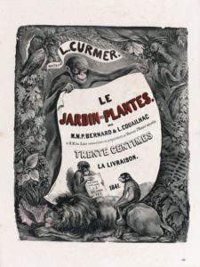 AFFICHE DE LIBRAIRIE pour Le Jardin des Plantes, par MM. P. Bernard, L. Couailhac et M. M. les Aides naturalistes et préparateurs au Muséum d’Histoire naturelle. Trente centimes la livraison. P., Curmer, 1841. Très belle affiche romantique. Lithographie originale, Formantin et Cie impr., grand in folio en hauteur imprimée en trois tons : noir, rose et vieux rouge. (Inf. rouss., plis médian).