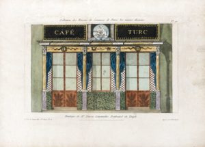 LA MESANGERE. Collection des Maisons de Commerce de Paris (et intérieurs) les mieux décorées. A Paris, rue St Avoye, 51, s. d. (1806-1810). In-4 oblong, étui à chemise demi-maroq. citron à grain long, coins, titre en long, n. r. (Cart. moderne). PRECIEUX RECUEIL, de 35 planches (sur 50), numérotées dans le haut de 1 à 34 et 36, gravées et coloriées à l’époque, représentant des intérieurs et extérieurs des Plus belles boutiques de Paris, sous le Premier Empire et la Restauration, on y trouve également quelques intérieurs de Palais où habitations particulières. Ces planches, même isolées, sont devenues introuvables ! Un tel recueil est de la plus grande rareté. (L’exemplaire du Cabinet des Estampes et celui des Arts Décoratifs sont incomplets). Nos épreuves sont à toutes marges et de premier tirage (avec l’adresse : A Paris, rue St Avoye, No 51).