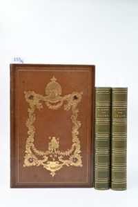 ROGERS (Samuel). Italy, a Poem - Poems by Samuel Rogers. London, T. Cadell 1830-34. 2 vol. in-8, maroq. vert, dos ornés, encadré. de 3 fil. sur les plats, large dent. intér., tête dor., n. r. (Niedrée). Très jolis volumes illustrés par Turner et Stothard de nombreuses et fines gravures sur acier, semées dans le texte ou à pleine page. Exemplaires de premier tirage, en superbe condition; les illustrations du premier volume étant avant les noms des artistes. De la bibliothèque L. de Montgermont (vente 11 Mai 1912, No 251 du cat.). Joint : BARTHELEMY (A. - M.). La Bouillotte, poème en cinq parties. P., Impr. Everat, 1839. In-8 de 77 pp., charge. beige, plats ornés d’un encadr. doré de fers rocaille et de guirlandes enfermant dans les angles les as de trèfle, coeur, pique et carreau ainsi que des figures de valets, fil. dr. et large fil. à froid sur les bords, dos long orné de fers rocaille, dent. int., tr. dor. (Capé). EDITION ORIGINALE de ce poème amusant sur le jeu de la bouillotte, très bien imprimé et tiré à petit nombre et par souscription pour les membres d’un cercle de la rue des Pyramides (ici M. Philippon). TRES CURIEUSE ET FRAICHE RELIURE DE CAPE, AVEC FERS EMBLEMATIQUES. Un exemplaire dans une reliure identique, ayant appartenu à Rachel, se trouvait dans la bibliothèque de Laurent Pichat. Ens. 3 vol.