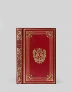 VATOUT (J.). Histoire du Palais-Royal. P., (Imprimerie de Gaultier-Laguionie), 1830. In-8, cuir de Russie rouge, armoiries, plats encadrés de rangs de fil. et fleurons d’angles dorés, dos orné, armorié et chiffré, dent. intér., tr. dor. (Simier, relieur du Roi). EDITION ORIGINALE. Exemplaire sur papier vélin, aux armes de LOUIS-PHILIPPE, DUC D’ORLEANS. Le dos de la reliure, orné de beaux fers et entrelacs de filet porte dans le haut le blason réduit, et au bas le chiffre couronné du prince. Cachet de la bibliothèque du Château d’Eu au chiffre L. P. apposé sur le titre. SUPERBE EXEMPLAIRE.