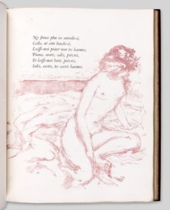 BONNARD (Pierre). - VERLAINE (Paul). Parallèlement. Lithographies originales de Pierre Bonnard. P., Impr. Nationale, A. Vollard, édit., 1900. In-4 (298 x 242 mm), maroq. rouge jans., tr. dor. sur témoins, couv. ill. et dos cons. (H. Lesieur). Frontispice et 108 lithographies de Pierre Bonnard tirées en rose, dont 21 à pleine page et 9 bois en noir. TIRAGE A 200 EXEMPLAIRES. Un des 170 sur vélin de Hollande, celui-ci le n° 167. Exemplaire avec titre et couverture en second tirage, avec une vignette dessinée par Bonnard qui remplaça celle de l’Imprimerie nationale. «Pour accompagner les poèmes de Verlaine, Bonnard invente une composition irrégulière; les lithographies jouent avec les strophes, les enlacent, se mêlent à elles ou se glissent dans les marges, images voluptueuses et tendres dont le pouvoir de suggestion s’allie miraculeusement à l’art du poète [...] (Terrasse Bonnard, p. 62). Bonnard dit lui-même qu’il avait «tenu aux lithographies en rose, ce qui me permettait de mieux r endre l’atmosphère poétique de Verlaine». Rauch, 21 ; Garvey, 27. PREMIER LIVRE EDITE PAR AMBROISE VOLLARD, RECONNU COMME SON CHEF-D’OEUVRE. L’UN DES PLUS BEAUX LIVRES ILLUSTRES MODERNES.