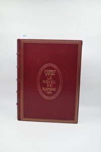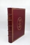 DIDEROT. Le Neveu de Rameau, d’après le manuscrit original publié par Georges Monval. Préface de Louis Barthou. Illustrations de Bernard Naudin. P., Blaizot, 1924. In-4, maroq. grenat, dos à 5 nerfs avec fil. brisés, encadr. dor., fil. sur le premier plat avec titre au centre, 6 fil. intér., gardes soie moirée, tête dor., n. r., couv. et dos cons., étui (Langrand). TIRAGE A 355 EXEMPLAIRES (papier vélin de Rives, numéroté). Frontispice, portrait, deux culs-de-lampe gravés à l’eau-forte et 34 illustrations de Bernard Naudin imprimées en taille douce en deux tons, dont 32 tirées hors texte et une sur double page. Très beau dessin original au format du livre ajouté ainsi qu’une l. a. s. de l’artiste, adressée à Lucien Descaves (une p. grand in-8). Ex-libris G. Potel.