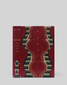 DEREME (Tristan). L’Enlèvement sans clair de lune ou les propos et les amours de M. Théodore Decalambre. Préface en partie inédite de M. Théodore Decalambre. Illustré d’eaux-fortes en couleurs à deux planches de J.-E. Laboureur. P., Les Bibliophiles de l’Automobile-Club de France, 1931. Gr. in-8, maroq. grenat, important décor sur les plats de volutes verticales formées par de fines bandes horizontales juxtaposées en maroq. de 7 nuances de vert, rangée verticale au centre des plats d’étoiles dorées, dos orné et mosaïque., à l’intér. double et gardes de daim violine dans un encadr. de maroq. blanc, tr. dor., couv. et dos cons., chemise et étui (Paul Bonet, 1952). Joli livre, tiré à 129 exemplaires, tous sur papier japon nacré, numérotés, illustré par J.-E. Laboureur de 21 très belles eaux-fortes originales en couleurs, dont une servant de frontispice, les autres dans le texte. Exemplaire exceptionnel, enrichi d’une des très rares suites à part de toutes les eaux-fortes, également sur japon nacré, du dessin original de Laboureur illustrant le menu du déjeuner de la Société, d’une épreuve avant la lettre de ce menu, d’une lettre et de deux quatrains autographes de Tristan Derème: Le Temps renverse nos maisons... et Diane, à qui plaisent les hurlements...adressés à M. Jacques André. RAVISSANTE RELIURE MOSAIQUEE DE PAUL BONET. De la bibliothèque Jacques André (vente 27 Nov. 1951, No 85 du cat.).