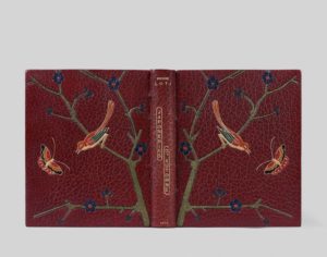 LOTI (Pierre). Japoneries d’Automne. P., Calmann Lévy, 1889. In-12, maroq. grenat, titre en long au dos, sur les plats, décor mosaïqué d’une branche fleurie avec oiseau et papillon, gardes de soie décorée, bande de maroq. intér. avec fil. or, n. r., couv. cons., étui (H. Sacré). EDITION ORIGINALE. UN DES 25 EXEMPLAIRES DE TETE SUR JAPON, numéroté avec couverture rouge saumon. PRECIEUX EXEMPLAIRE UNIQUE AYANT APPARTENU AU PEINTRE HENRY SOMM, l’un des meilleurs maîtres de la période 1900, artiste « japonisant » qui a orné le faux-titre d’une importante aquarelle recouvrant entièrement celui-ci, une autre aquarelle, à pleine page, sert de frontispice au chapitre Un Bal à Yeddo, 18 autres aquarelles sont placées en tête et fin de chapitre, deux autres en marges du texte. AU TOTAL 21 JOLIES AQUARELLES ORIGINALES DE SOMM, TOUTES SIGNEES. Ajoutée à l’ouvrage, une l.a.s. de Loti à Alph. Daudet (4 p. in-12): « Je suis à Rochefort depuis quinze jours, installé dans le beau poste de secrétaire de l’amiral ; c’est fait pour moi ce poste là, comme un perchoir et une chaîne à perroquet pour un goéland... Je n’ai pas encore pu me remettre à travailler des histoires japonaises ; je commencerai par celle que je voudrais dédier à Madame Daudet... ». Joint : Les Désenchantées. P., Calmann-Lévy, 1906. In-12, rel. maroq. vert jans., tr. dor. sur témoins, couv. et dos cons., étui (Alix). Un des 25 sur japon impérial. Ens. 2 vol.