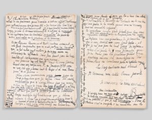 ROUAULT (Georges) - SUARES (André). Passion. Eaux-fortes originales en couleurs et bois dessinés par Georges Rouault. Paris, Ambroise Vollard, 1939. In-folio (455 x 345 mm), en feuilles, couv. ill. Tirage limité à 245 exemplaires sur Montval. UN DES 40 PREMIERS EXEMPLAIRES, SIGNES PAR L’ARTISTE, comportant une suite à part en noir des 17 eaux-fortes originales, n° 34. Très beau livre, illustré par Georges Rouault de 17 eaux-fortes originales hors texte en couleurs et 82 bois gravés par Georges Aubert. On a joint un important ensemble de lettres adressées par Rouault à son éditeur Vollard témoignant de l’état d’épuisement et d’irritabilité où l’on conduit l’entreprise trop lourde de Passion, le Cirque et Miserere. - Prière à Vollard : 3 p. in-8 sous enveloppe timbrée et datée Oct. 33. - Résidu : 7 p. sous enveloppe adressée à M. Vollard EV. « Je suis troublé dans mon travail croyez je vous le dis amicalement ce n’est pas le moment de me replonger dans les barbelés des questions des parlotes même amicales sur la peinture et la gravure. Degas Cézanne Renoir - et tant d’autres auraient pu vous faire comprendre que ce n’est pas par la langue que ce fait notre saint métier... Nous faisons un art muet dirait le vieux Poussin... Je vous le dis ici sans parti pris vous n’êtes guerre reconnaissant du mal qu’on se donne pour vous - je ne demande pas la reconnaissance mais la paix dans le travail c’est bien le moins. Isabelle Rouault et François Chapon, 257-273.