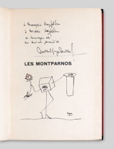 GEORGES-MICHEL (Michel). Les Montparnos. Roman illustré par les Montparnos. P., Fasquelle, 1929. In-12, demi-veau noir, plats toile rouge, tête dor., n. r., couv. et dos cons. (Martin). EDITION ORIGINALE de ses souvenirs sur les peintres de Montparnasse, illustrés par ceux-ci : Modigliani, Picasso, Foujita, Juan Gris, F. Léger, Survage, Soutine, Bakst, Metzinger, Kisling... L’UN DES 100 EXEMPLAIRES SUR JAPON IMPERIAL numérotés, celui-ci avec dédicace et croquis de l’auteur sur le faux-titre.
