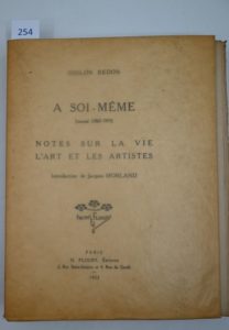 REDON (Odilon). A Soi-Même. Journal (1867-1915). Notes sur la vie, l’art et les artistes. Introduction de J. Morland. P., Floury, 1922. Petit in-4 br. EDITION ORIGINALE, ornée d’un portrait. L’un des 125 exemplaires de tête, sur papier vélin pur fil, numérotés, renfermant une EAU-FORTE ORIGINALE de Redon : La Petite Madone. (Mellerio, 21).