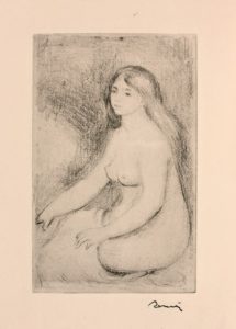 VOLLARD (Ambroise). La Vie et l’OEuvre de Pierre Auguste Renoir. P., Ambroise Vollard, 1919. Fort In-4 broché, couverture illustrée imprimée rempliée. Edition comprenant en frontispice une eau-forte originale de P.-A. Renoir : Baigneuse Assise (Delteil, 11) portant le timbre de la griffe de l’artiste (Lugt,2137a), 225 reproductions d’oeuvre du Maître dont une lithographie en couleurs hors texte de Clot, et 51 héliogravures sur cuivre en hors-texte. (Rouss.)