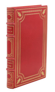 Paris, L. Carteret, 1924. In-4, maroquin rouge, plats ornés d'un encadrement de filets dorés et quatre faisceaux du licteur dorés aux angles, dos orné avec auteur et titre dorés, encadrement intérieur de même maroquin orné de filets dorés et à froid, doublure et gardes de moire prune, tranches dorées sur témoins, couverture et dos, étui (E. Maylander).Première édition illustrée, ornée de 25 eaux-fortes en noir, dont 7 à pleine page de Jacques Camoreyt.