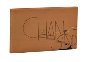 La Connaissance, 1926. In-8 oblong, box fauve, premier plat orné d'un titre en grandes lettres noires et dorées avec pièces mosaïquées de box noir et rouge figurant une portée musicale, dos lisse orné, doublure du même box, gardes de soie moirée noire, tranches dorées sur témoins, couverture et dos, chemise et étui (Rose Adler 1930 – A. Jeanne dor.).Tirage limité à 200 exemplaires sur Hollande van Gelder Zonen, celui-ci exemplaire n° 1.