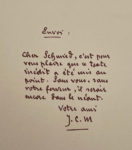 Exemplaire enrichi d'un envoi autographe signé de l'auteur à François-Louis Schmied : « Cher Schmied, c'est pour vous plaire que ce texte inédit à été mis au point. Sans vous, sans votre ferveur, il serait encore dans le néant. Votre ami J.C.M.»