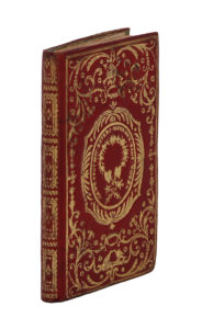 Paris, Boulanger, [1787]. In-24, maroquin cerise, dos à faux-nerfs et compartiments dorés, les plats ornés de deux plaques dans le style de Dubuisson (les mêmes sauf le milieu) constituées de très riches fleurons rocailles au décor souple et harmonieux comprenant filets, petits fers et couronne de lauriers, avec en haut un cœur transpercé de deux flèches, en bas deux colombes qui se becquettent ; au premier plat une couronne de fleurs avec deux cœurs et la légende « ils ne peuvent estres heureux sans vous » ; au second, deux mains qui se tiennent sous une couronne de fleurs au-dessus d’un pré ; dentelle intérieure, gardes de tabis émeraude, tranches dorées (Reliure de l'époque).Titre gravé (au verso étiquette verte collée : « remarques pour la présente année 1787 ») ; calendrier replié (de janvier à juin 1787) ; première vignette ; p. 4 à 62 (les 11 vignettes suivantes sont comprises dans la pagination, mais les versos blancs ne le sont pas) ; calendrier replié (de juillet à décembre) ; 1 f. (privilège).