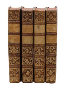 Paris, P. G. Simon ; Bordeaux, Chapuis l’aîné, 1761-1764. 8 tomes en 4 volumes in-4, veau fauve marbré, dos à nerfs ornés de fers dorés, tranches rouges (Reliure de l'époque).Vol. 1. : 3 ff. et 1 bl.- XXXVIII- 256 pp. (manque le premier cahier de la table t. I : pp. IX – XVI) ; 2 ff.- IV-324 pp., frontispice et 5 planches. Vol. 2 : 3 ff. – 315 pp. ; 2 ff.- 304 pp., 6 planches. Vol. 3 : 2 ff.- 300 pp. ; 2 ff.- 303 pp., 7 planches. Vol. 4 : 2 ff.- 302 pp. ; 2 ff.- 304 pp.- 1 f., 3 planches.