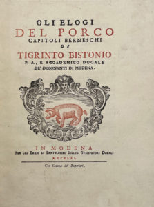 [FERRARI (Guiseppe)] — Gli elogi del porco, capitoli berneschi di Tigrinto Bistonio p.a., e Accademico Ducale de’ dissonanti di Modena.