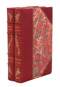 Paris, Louis Carteret, 1923. 2 volumes in-8, demi-maroquin rouge avec coins, dos orné de de guirlandes de fleurs et feuilles finement mosaïquées, tête dorée, couverture (F. et M. Maligne).Une des plus belles éditions de l'ouvrage, illustrée de 33 compositions d'Henri Pille gravées par Louis Monziès et de 34 compositions de Maurice Leloir gravées par Louis Boisson.