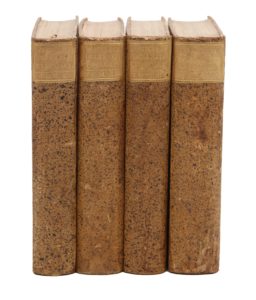 Paris, Durand, 1769. 4 volumes in-12, cartonnage de papier beige moucheté, pièce de titre havane sur les dos, tranches jaspées (Reliure du XIXe siècle).viii-498-(5) pp. – 2 ff., 496 pp. – 2 ff., 495 pp. – 2 ff., 383-(2)-166 pp.