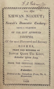 [CUISINE PERSANE-IRANIENNE] — The Khwan Niamut, Or, Nawab's Domestic Cookery: Being a Selection of the Best Approved Recipes, of the Most Flavoured and Savoury Dishes, from the Kitchen of Nawab Qasim Uli Khan, Buhadur Qâum Jung.