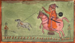 Vignette coloriée représentant un chasseur persan à cheval, encollé sur un feuillet de garde.