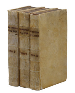 Paris, L. Cellot, 1778. 3 volumes in-12, vélin ivoire, tranches marbrées (Reliure de l'époque).Seconde édition de cet important recueil, qui fut publiée pour la première fois en 1755 : « ses menus saisonniers […] mentionnent la décoration des repas […]. Plus de deux mille recettes concernent viandes, poissons, pâtisseries, huîtres, omelettes et l'office (conserves, confitures, pastillages et sables décoratifs). Le service est indiqué en marge. La diététique est absente. » (Livres en bouche).
