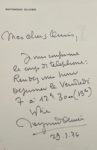 On joint une note manuscrite signée de Raymond Oliver et agrémenté d’un dessin « Conseils à un ami » 1 p. in-4 sur un double feuillet ; une belle photographie (25,5 x 20,5 cm) de Raymond Oliver et une photographie (11,5 x 17,7 cm) de Jean Cocteau ; une lettre autographe signée de R. Oliver, 1 p. in-8 et son enveloppe ; une invitation et le double feuillet de présentation de ce livre à la Galerie Jean Giraudoux ; le menu du diner du Jeudi 28 octobre 1976 (repas pour le Roi d’Espagne).