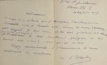On joint une lettre autographe signée M. L. Daudet du 24 juin 1919 (la partie vierge du bas de la lettre a été coupée). Elle répond à sa correspondante qu’elle donnerait avec plaisir l’autorisation (d’utiliser des parties de son livre), mais doit avoir l’aval de Fayard. La réponse de ce dernier sera envoyée à Bertrand Guégan. – Une lettre autographe signée Pampille à la même, du 25 juin 1919 : Elle a l’autorisation de Fayard. – Un menu manuscrit et illustré d’une aquarelle « Banquet du Cercle Fustel de Coulanges ». Menu de Charles Maurras. Elle y a noté des commentaires peu amènes sur les convives, et, probablement plus tard, au crayon bleu « Parle-t-il de boulot ? / je ne pourrai pas applaudir ».