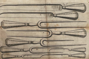 Le frontispice représente un repas de 15 personnes dans une salle à manger, entourés de l’officier de bouche et du personnel de service. Une planche dépliante représentant couteaux et fourchettes, et 23 planches présentant la découpe du gibier et de la volaille, mais aussi du poisson, des crustacés et des fruits.