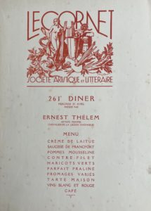 Goguette fondée en 1896 par Georges Courteline, Paul Delmet, Bertrand Millanvoye et Albert Michaut, l’association artistique Le Cornet rassemblait des hommes de lettres, des artistes et des notables autour d’un bon repas. Son nom vient du cornet à dés qui servit à désigner celui qui paierait l’addition lors de cette soirée inaugurale de 1896.