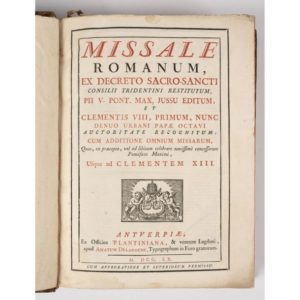 MISSALE ROMANUM, ex decreto sacrosancti concilii Tridentini restitutum. Concilii Tridentini Restitutum… Anvers, Plantin, Delaroche, 1765. Fort in-folio, veau brun, dos à nerfs orné (Rel. de l'époque). Quelques gravures sur bois et musique notée. Reliure épidermée. Signets marginaux de soie verte ou rose. 30,5 x 23,6 CM