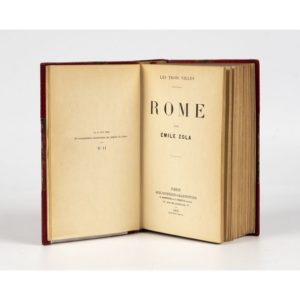 ZOLA (Émile). Les trois villes. Rome Paris, G. Charpentier et E. Fasquelle, 1896. Fort in-12, demi-maroquin rouge à coins, dos à nerfs, tête dorée, couv. et dos conservés (Rel. de l'époque). Édition originale. Un des 30 exemplaires de tête sur japon, n° 11 (suivis de 300 sur hollande). Infimes frottements à un mors et aux coins supérieurs.