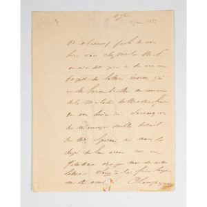 STENDHAL. Lettre autographe signée du pseudonyme "Champagne", à son ami l'avocat florentin, Vincenzo Salvagnoli, datée [Rome] 11 juin [1833]. 1 page in-4, adresse au verso, marque postale "Livorno 20 giugno", trace de cachet (avec petit trou atteignant quelques lettres). Stendhal évoque une soirée chez le marquis Lodovico Potenziani, gouverneur de la Banca Romana, et son épouse Angelica, à Rome. "On a beaucoup parlé de vous hier soir chez Me la M. P. On m'a dit qu'on a de vous un paquet de lettres énorme, j'ai vu des larmes briller en souvenir de la maladie de M. votre frère. On vous désire ici. Souvenez-vous de m'envoyer mille détails sur Me Speroni, son mari, le degré de leur amour & c, & c. J'étudierai chaque mot de votre lettre. Soyez à la faire longue. Mille amitiés". Stendhal, récemment nommé consul à Civitavecchia (en 1831, poste qu'il gardera jusqu'en 1841, année de sa mort), sillonna la Toscane. À Florence, fréquentant le cabinet Vieusseux, société littéraire fondée par l'éditeur Giovan Pietro Vieusseux, il devint l'ami du jeune avocat Vincenzo Salvagnoli (1802-1861). Salvagnoli fut directeur de La Patria à Florence en 1847, membre du Conseil général d'Empoli en 1848 ; il dut un temps d'exiler d'Italie pour ses opinions libérales, avant de devenir Ministre des cultes en 1858. Plis marqués.