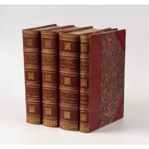 CARTERET (Léopold). Le Trésor du bibliophile romantique et moderne 1800-1875. Paris, L. Carteret, février 1924. 4 vol. in-4, demi-maroquin rouge à coins, dos à nerfs orné, tête dorée, couv. et dos cons. (Randeynes et fils). Édition originale, illustrée de 281 planches dont 251 en couleurs. Tirage sur beau papier vélin. Charnières et dos frottés, un mors fendillé (tome I).