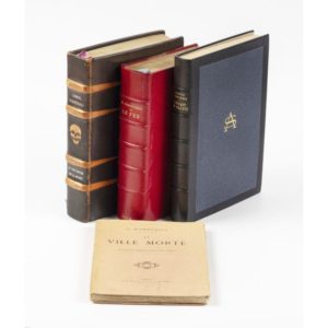 D'ANNUNZIO (Gabriele). La Ville morte. Tragédie moderne en cinq actes. Paris, Calmann-Lévy, 1898. In-12, broché. Édition originale française. Joints du même auteur : - Le feu. Paris, Crès et Cie, Les Maîtres du livre, 1919. 2 tomes en un vol. in-8, demi-maroquin rouge à coins, tête dorée, couv. et dos conservés (Marius Magnin). Nouvelle édition de la traduction de Georges Hérelle. Frontispices gravés à l'eau-forte par Maurice Achener. Exemplaire numéroté sur Rives. - Le Triomphe de la mort. Paris, Mornay, 1923. In-8, maroquin brun, dos orné de nerfs et tête de mort mosaïqués en maroquin fauve, tête dorée, couv. et dos cons. (Rel. de l'époque). Traduction de Georges Hérelle. Bois de Sylvain Sauvage. Exemplaire numéroté sur Rives. Charnières frottées. - L'enfant de volupté. Paris, Calmann-Lévy, 1971. In-8, maroquin noir, plats de papier gris avec chiffre doré AS, dos à nerfs, tête dorée, couv. et dos cons., étui bordé (Semet et Plumelle). Nouvelle édition complétée et rétablie dans l'ordre de l'originale italienne par Pierre de Montera.