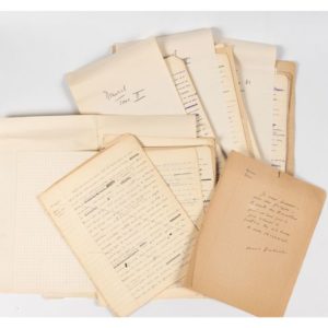 JOUHANDEAU (Marcel). Vers 1940, Mémorial. Manuscrit fragmentaire, avec envoi a. s. à l'éditeur Jacques Jourquin. Environ 200 feuillets manuscrits, détachés de cahiers d'écolier : brouillons, avec ratures, encres diverses - l'ensemble identifié a posteriori et ordonné sous chemises avec titres au crayon : Mémorial, tome I : env. 45 ff. "Querelles de mon père, Les Berrichons, les amours de mon père, Coiffeuse à domicile, La Petite sœur des bois, …". Mémorial, tome II : env. 40 ff. : "Le Théâtre de Soeur Ildefonse, Rose à Bourganeuf, Ma rencontre avec les livres… " Mémorial, tome III : 6 ff. : "La crémaillère". Mémorial, tome IV : 3 ff. : "Le bond de Gaston, J'ai joui". Mémorial, tome V ( : env. 65 ff. : "Le langage de la tribu, Valérie et Toussaint-Anner, Les Rogations, Les soupes rousses, Intervention de ma soeur…" Mémorial, tome VI : env. 35 ff. : "Anges musiciens…" Les six premiers tomes de "Mémorial" parurent de 1948 (I, Le Livre de mon père et de ma mère) à 1958 (VI, Les Chemins de l'adolescence), chez Gallimard. Envoi a. s. sur la chemise d'ensemble : "Pour Jacques Louvière, en souvenir du pacte que nous avons conclu hier sans signatures / samedi 30 mai 1964". JOUHANDEAU (Marcel). Important ensemble manuscrit autographe et tapuscrit de récits autobiographiques. Volumes sous emboitage, carnets intimes, feuillets ordonnés sous chemises annotées, journaux, brouillons, épreuves, corrections… Marcel Jouhandeau (1888-1979) fut un professeur adulé au collège de Passy à partir de 1912. Partagé entre un catholicisme fervent et ses attirances homosexuelles, entre le salut et la damnation, il composa une œuvre variée de romans, contes, chroniques, essais, et récits autobiographiques.